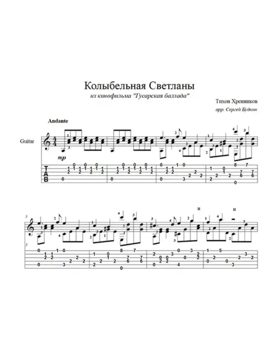 Аранжировка для гитары Колыбельной Светланы композитора Тихона Хренникова из кинофильма "Гусарская баллада".