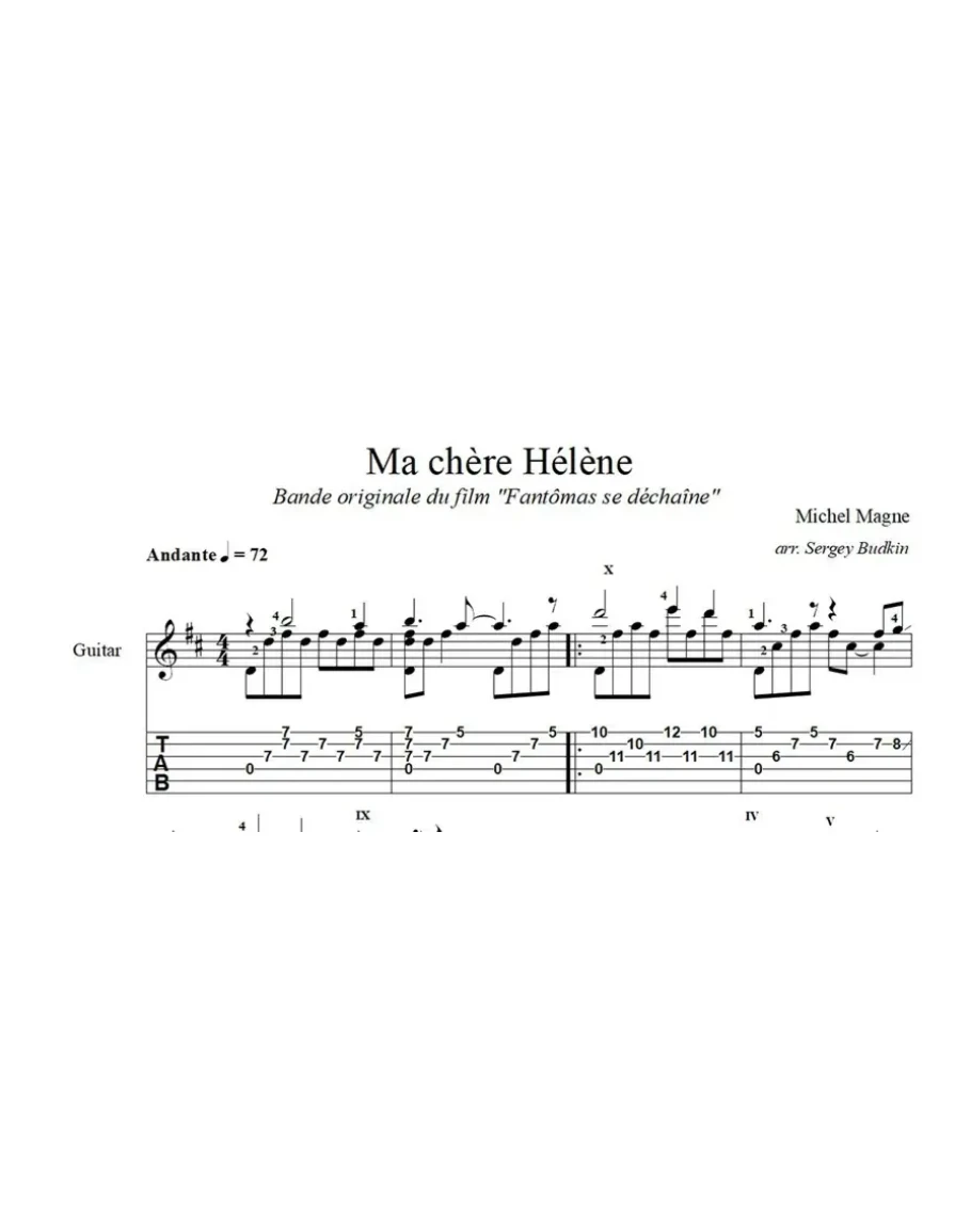 Аранжировка для гитары мелодии французского композитора Мишеля Маня Ma Chere Helene из кинофильма "Фантомас".