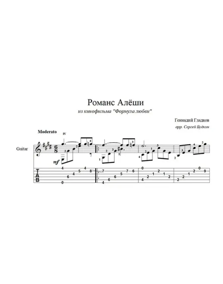 Аранжировка для гитары Романса Алёши (О, как же я люблю Вас, прекрасное созданье...) композитора Геннадия Гладкова из кинофильма "Формула любви".