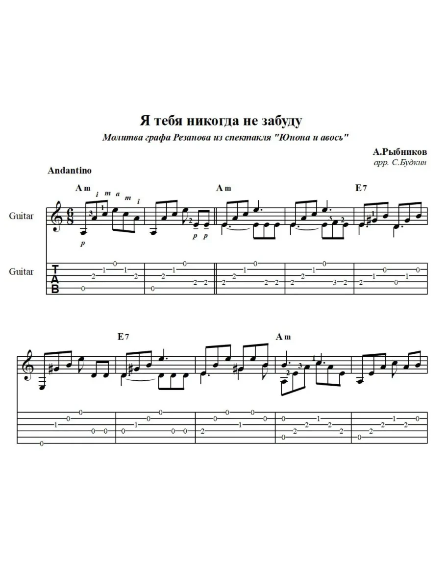 Я тебя никогда не забуду (Юнона и Авось) - для гитары