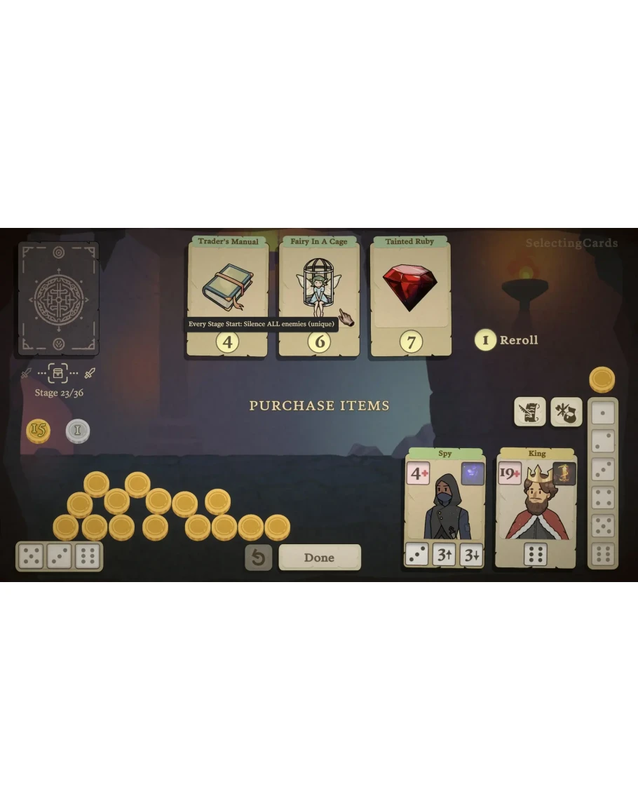 Кубики, урон, бросайте их на врагов. Вдохновлено Солитером, вид сверху, враги - карты.