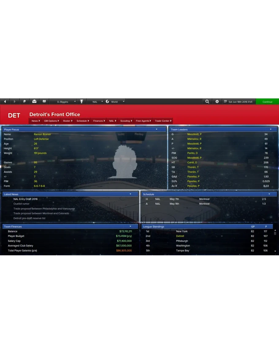 Полный контроль за созданием и развитием команды. Предложения контрактов, услуги скаутов, выбор на драфте многообещающих игроков и обмен с другими командами.