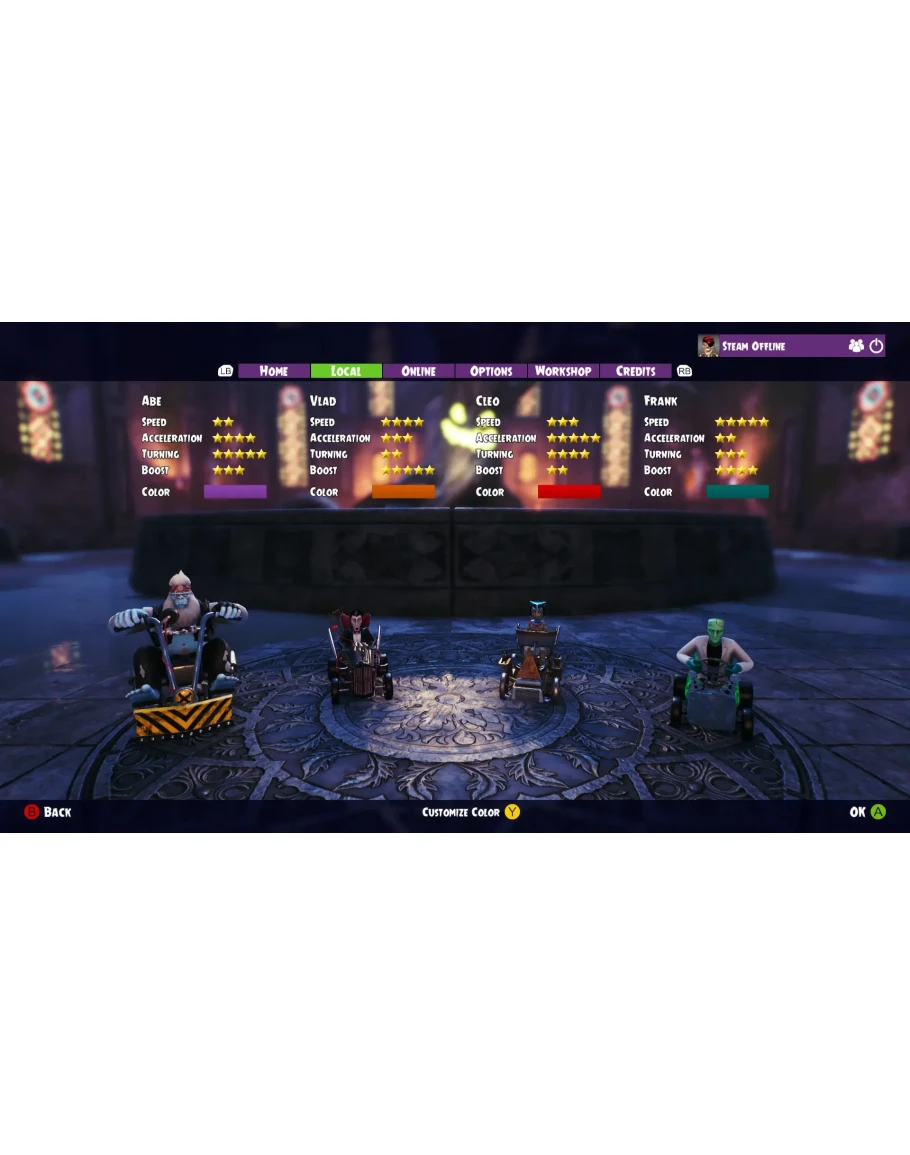 Выберите своего любимого монстра и примите участие в яростных соревнованиях по вождению за рулем самых дурацких автомобилей.