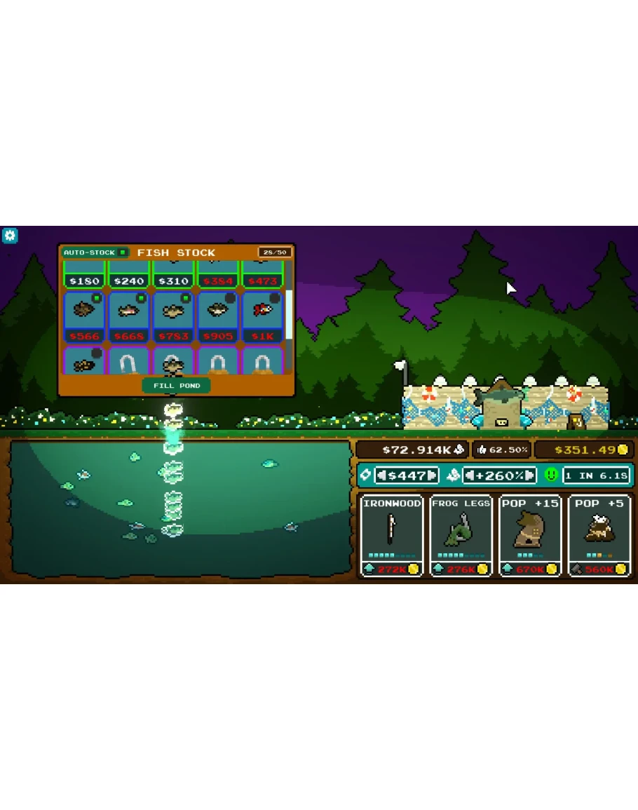 Заселите свой пруд редкой рыбой, постройте и улучшите свой магазин, привлеките жадных клиентов и управляйте своим бизнесом, чтобы стать легендарным рыболовным раем.