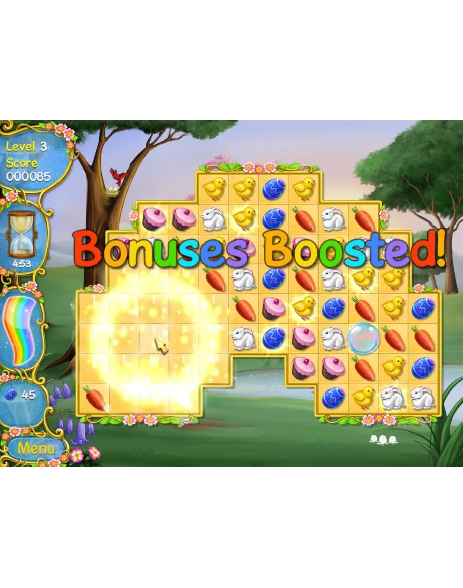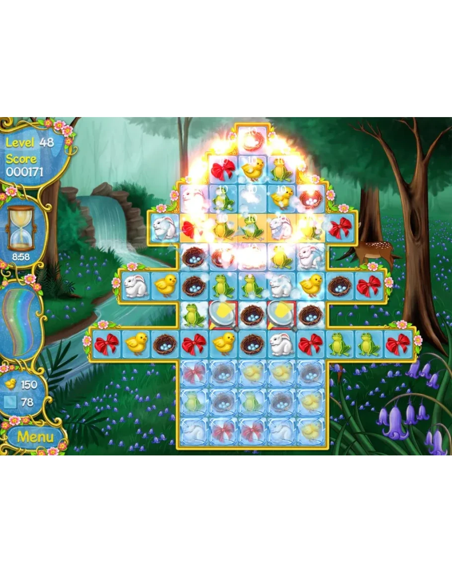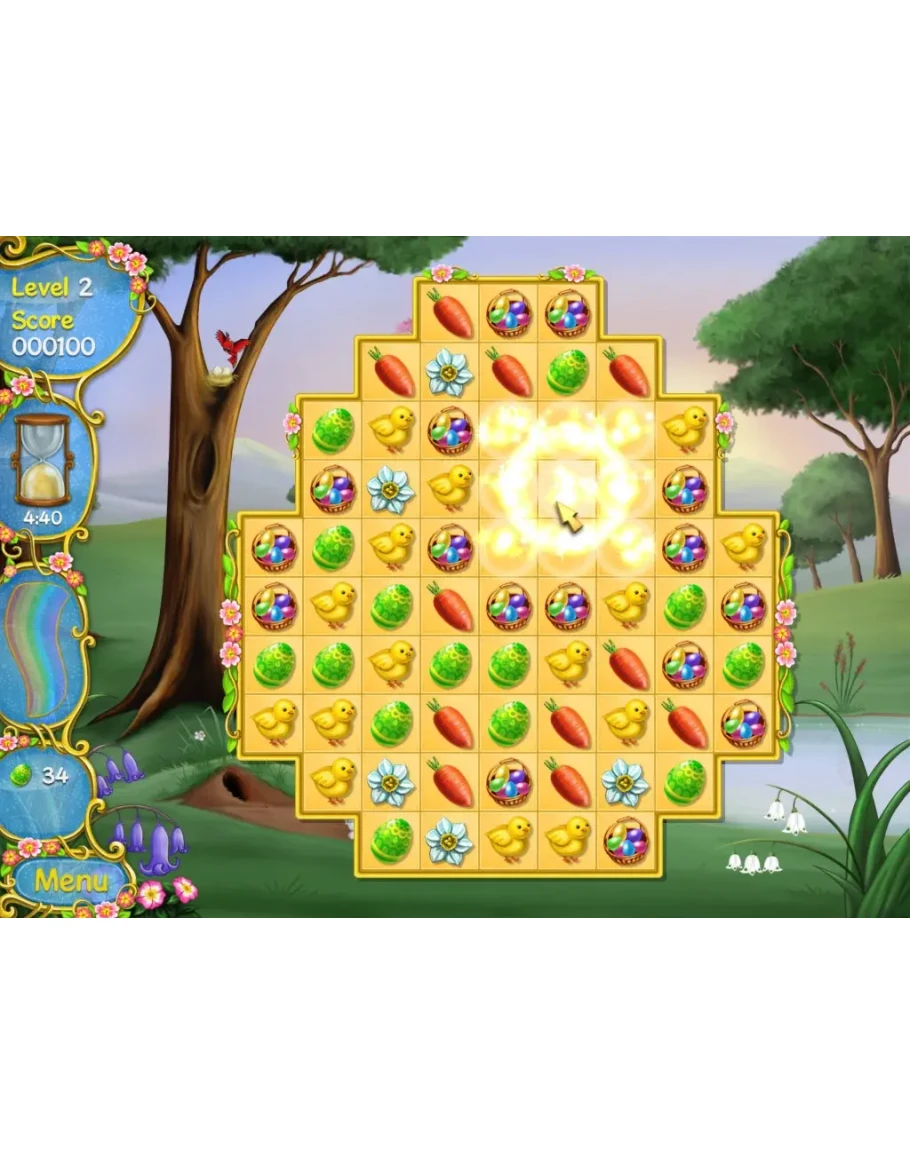 Путешествуйте по красивой весенней сельской местности с пасхальным кроликом в этой очаровательной игре в жанре «три в ряд».