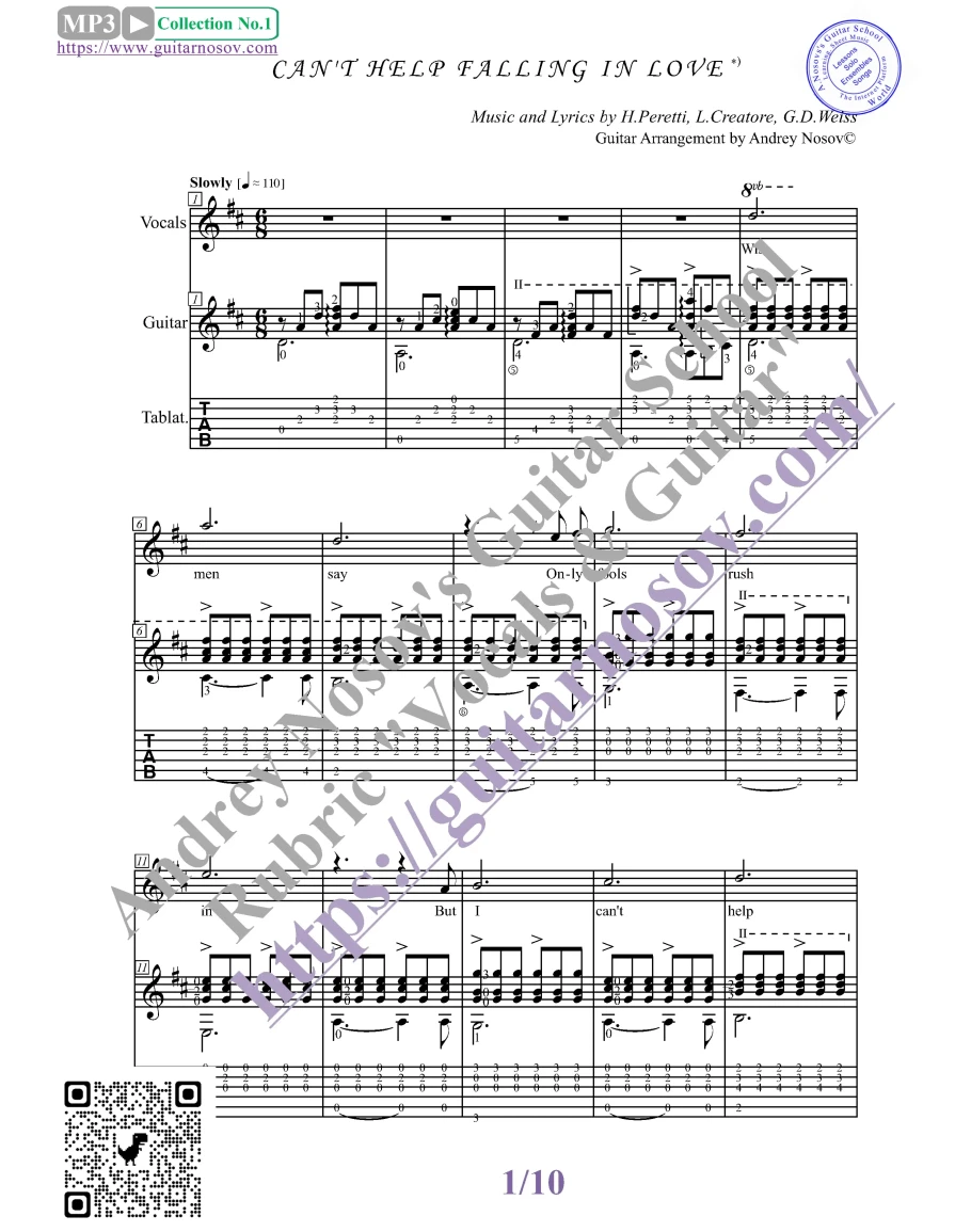 Кликните "Подробнее" для получения дополнительной информацииВашему вниманию предлагается композиция "Can't Help Falling in Love (H.Peretti, L.Creatore, G.D.Weiss)", предназначенная для вокала в сопровождении 6-ти струнной гитары. Запись выполнена нотами и включает в себя партию вокала с подтекстовкой, партию гитары с подробнейшей аппликатурой и текст песни (НА АНГЛИЙСКОМ). Партия гитары продублирована табулатурой.