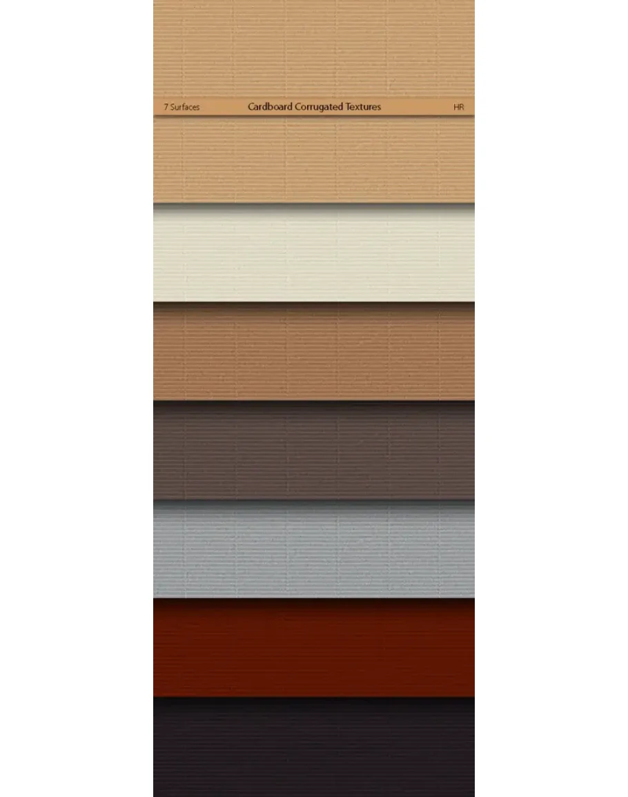Seven different color Cardboard Corrugated surfaces realistic texture backgrounds. Cardboard Corrugated Styles.