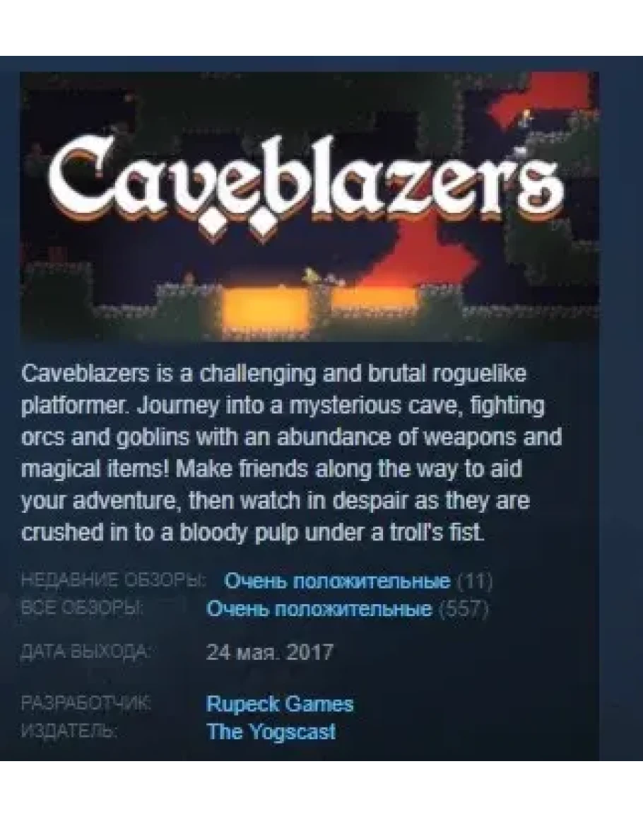 Caveblazers это платформер "рогалик" с фокусом на экшн, действия которого разворачиваются в фэнтезийном мире. Каждая игра уникальна с процедурно генерируемыми уровнями для вашего исследования и огромным количеством предметов, оружий и экипировки.