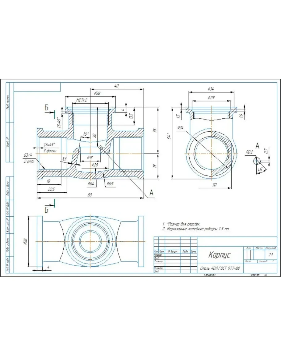 Рабочий чертеж детали корпус клапана в программе Компас 3D