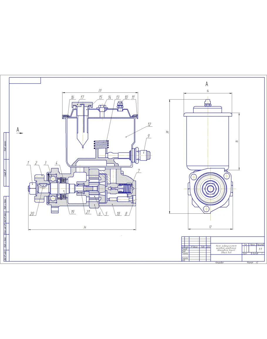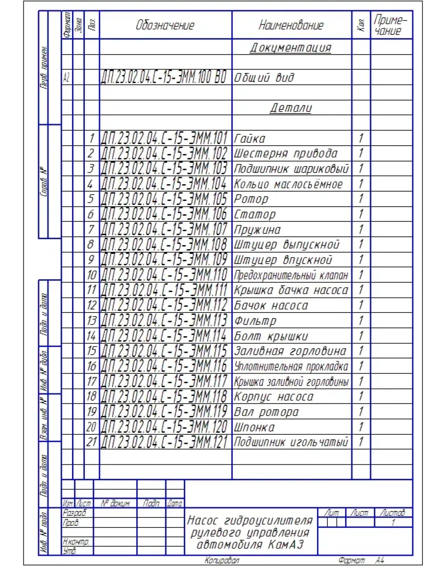 Чертеж Насос гидроусилителя рулевого управления автомобиля КАМАЗ + спецификация
