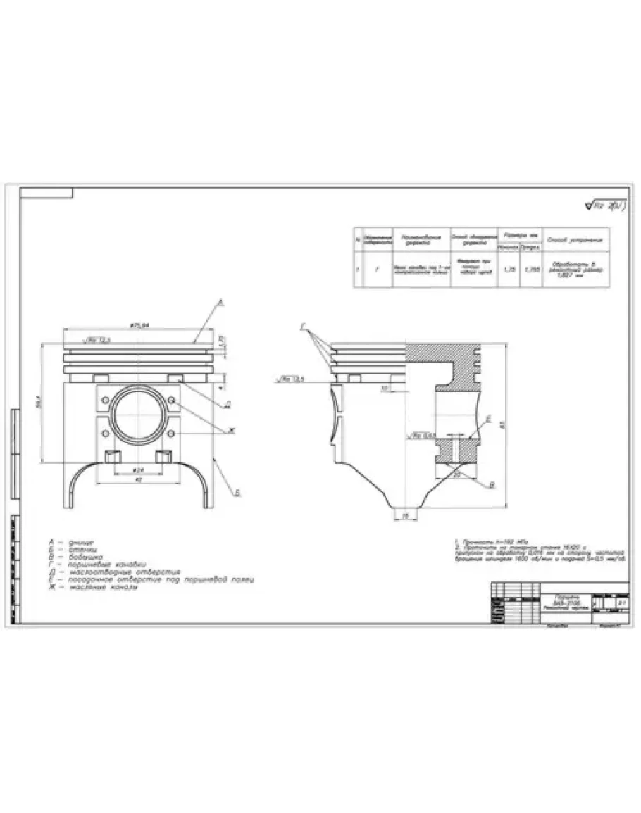 Ремонтный чертеж поршня автомобиля ВАЗ-2106 представлен на формате А1.