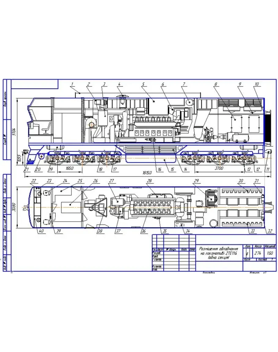 Чертеж тепловоза 2ТЭ116 формата А3 с размещением оборудования + 2 листа спецификации
