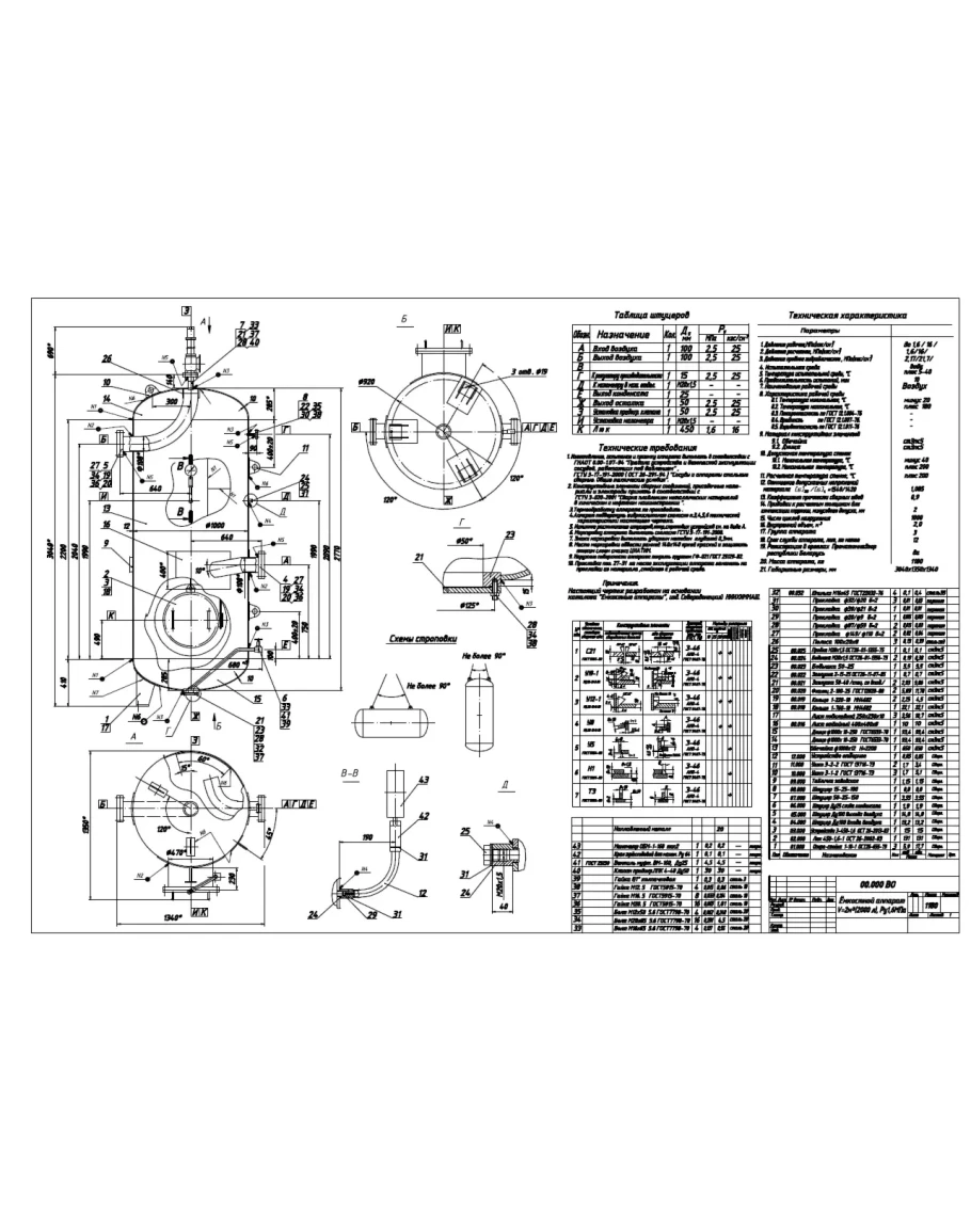 Чертеж воздухосборника V=2 м.куб Р=1,6 МПа формат DWG. В комплекте чертеж общего вида, сборочные чертежи, чертежи деталей, расчет на прочность.