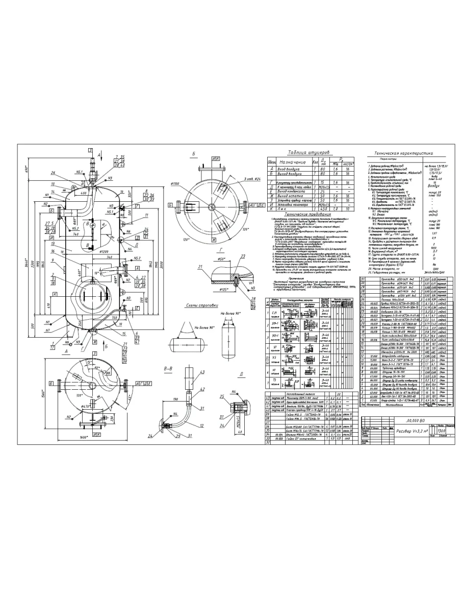 Чертеж воздухосборника V=3.2 м.куб Р=1.3 МПа (формат DWG). В коплекте чертеж общего вида, чертежи сборочных единиц, чертежи деталей, расчет на прочность.