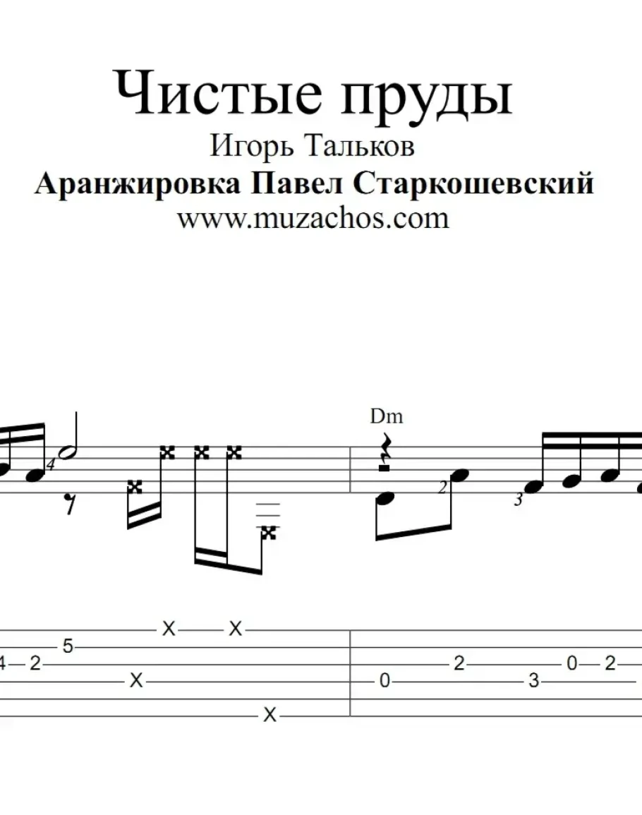 Ноты для одной гитары с аппликатурой левой руки и табулатура к переложению песни в исполнении И.Талькова "Чистые пруды". Форматы: pdf, guitar pro 6