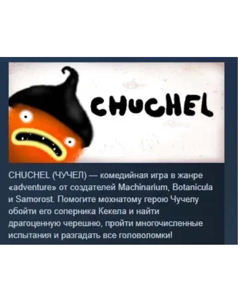 CHUCHEL (ЧУЧЕЛ) — комедийная игра в жанре «adventure» от создателей Machinarium, Botanicula и Samorost. Помогите мохнатому герою Чучелу обойти его соперника Кекела и найти драгоценную черешню, пройти многочисленные испытания и разгадать все головоломки!
