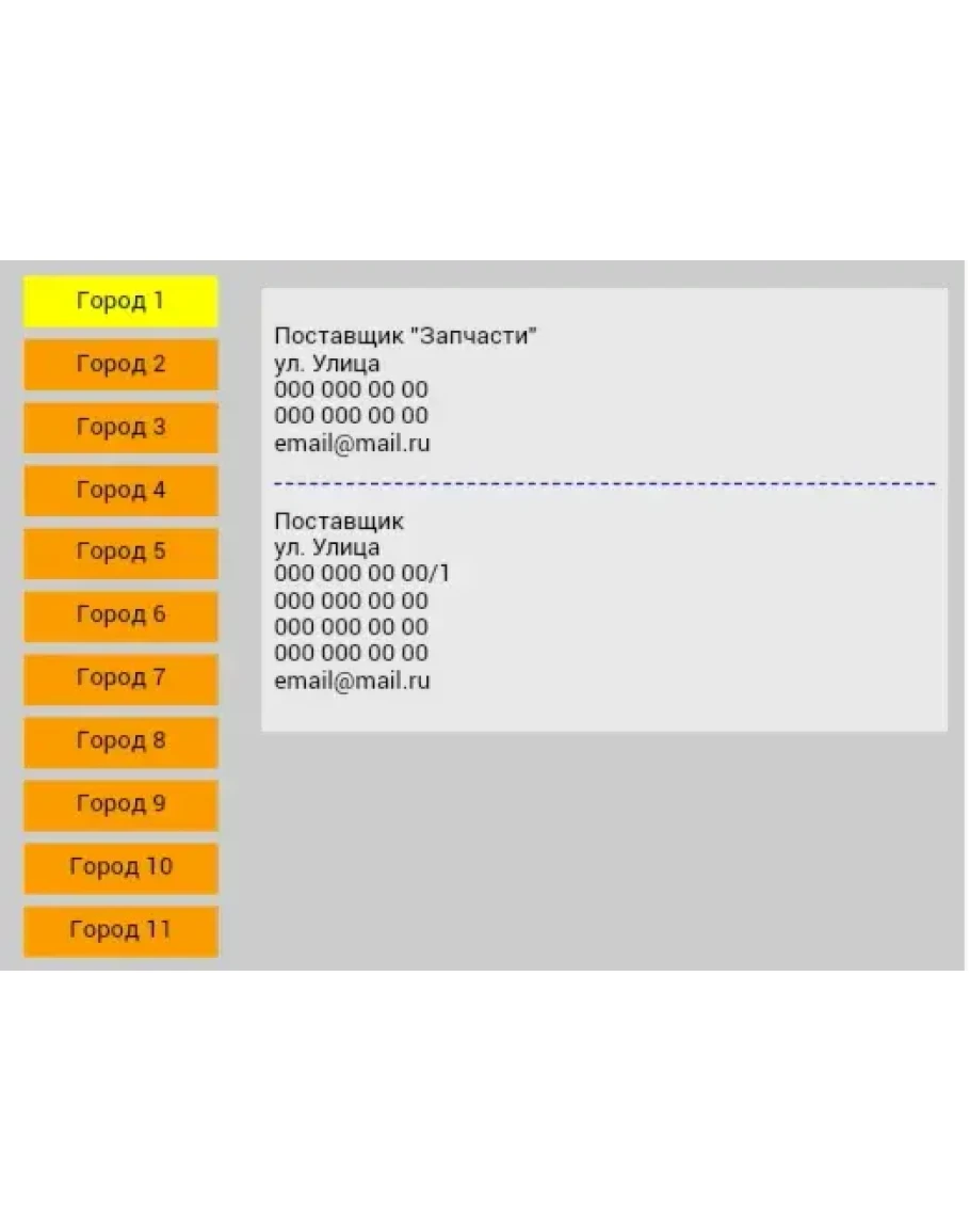 Скрипт предназначен для отображения контактных данных в зависимости от выбранного города. Т.е. может служить вам мини базой данных к примеру для вывода контактов поставщиков. Скрипт написан на html + css, с использованием jquery. В коде есть необходимые комментарии по заполнению базы данных.