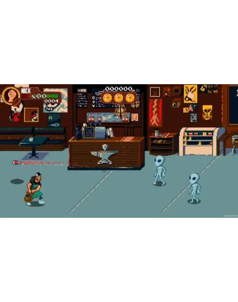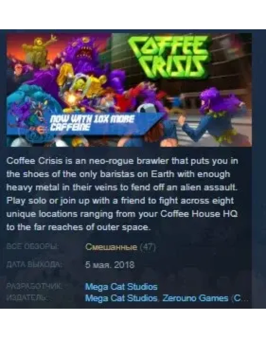 Coffee Crisis is a neo-rogue brawler that puts you in the shoes of the only baristas on Earth with enough heavy metal in their veins to fend off an alien assault. Play solo or join up with a friend to fight across eight unique locations ranging from your Coffee House HQ to the far reaches of outer space. Go up against an army of wild alien enemies, and the humans they have brainwashed with a variety of weapons, special moves, suplexes, and coffee!