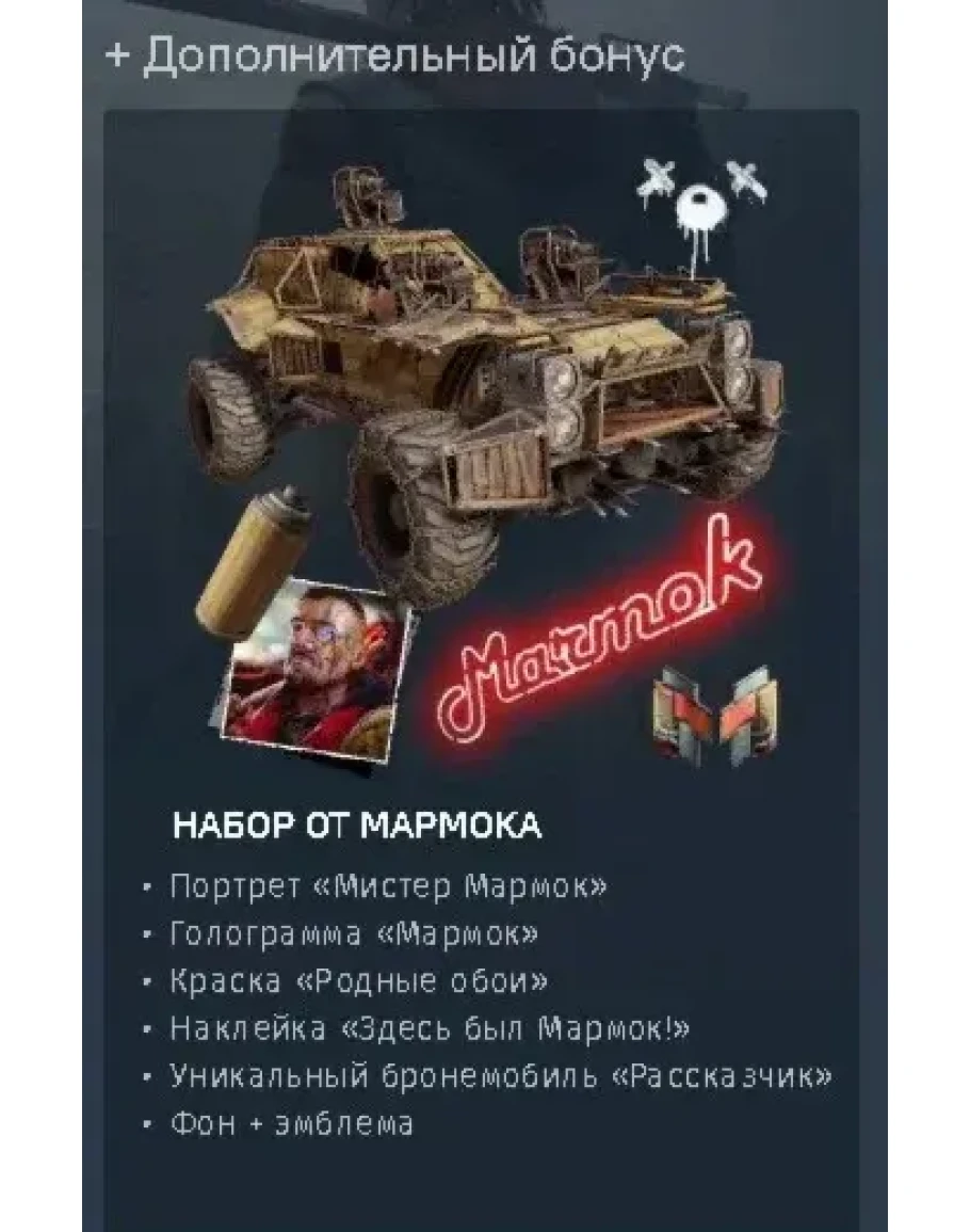 ✅После активации данной ссылки вы получаете набор, в который входит: Уникальный бронемобиль: «Рассказчик» Уникальный портрет Мистер Мармок Уникальный фон и эмблема для персонализации профиля Голограмма Мармок Баллончик с уникальной краской Родные обои Уникальная наклейка 2 × Здесь был Мармок!. Увеличение лимита используемых деталей: до 50