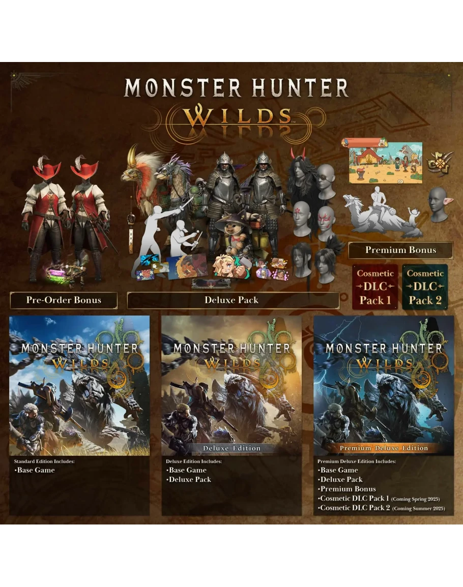 🎮 О игре: Monster Hunter Wilds Premium Deluxe Edition: Неистовая стихия дикой природы — не для слабых духом. Окружающий мир может измениться в мгновение ока! Это история о монстрах и людях, а также о том, как они пытаются гармонично сосуществовать в двойственном мире. В Monster Hunter Wilds вас ждет поистине незабываемая охота!