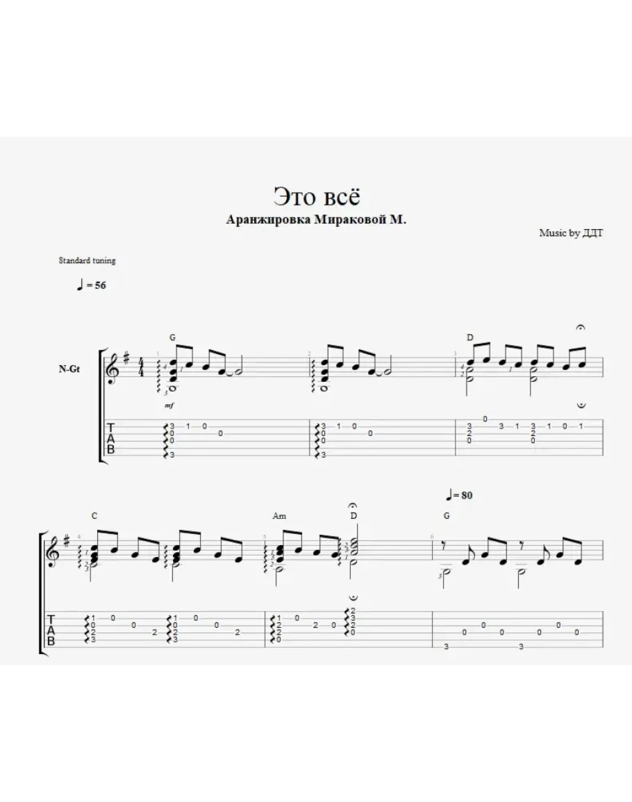 Несложная аранжировка для шестиструнной гитары от Марины Мираковой на композицию "Это всё" группы "ДДТ".
