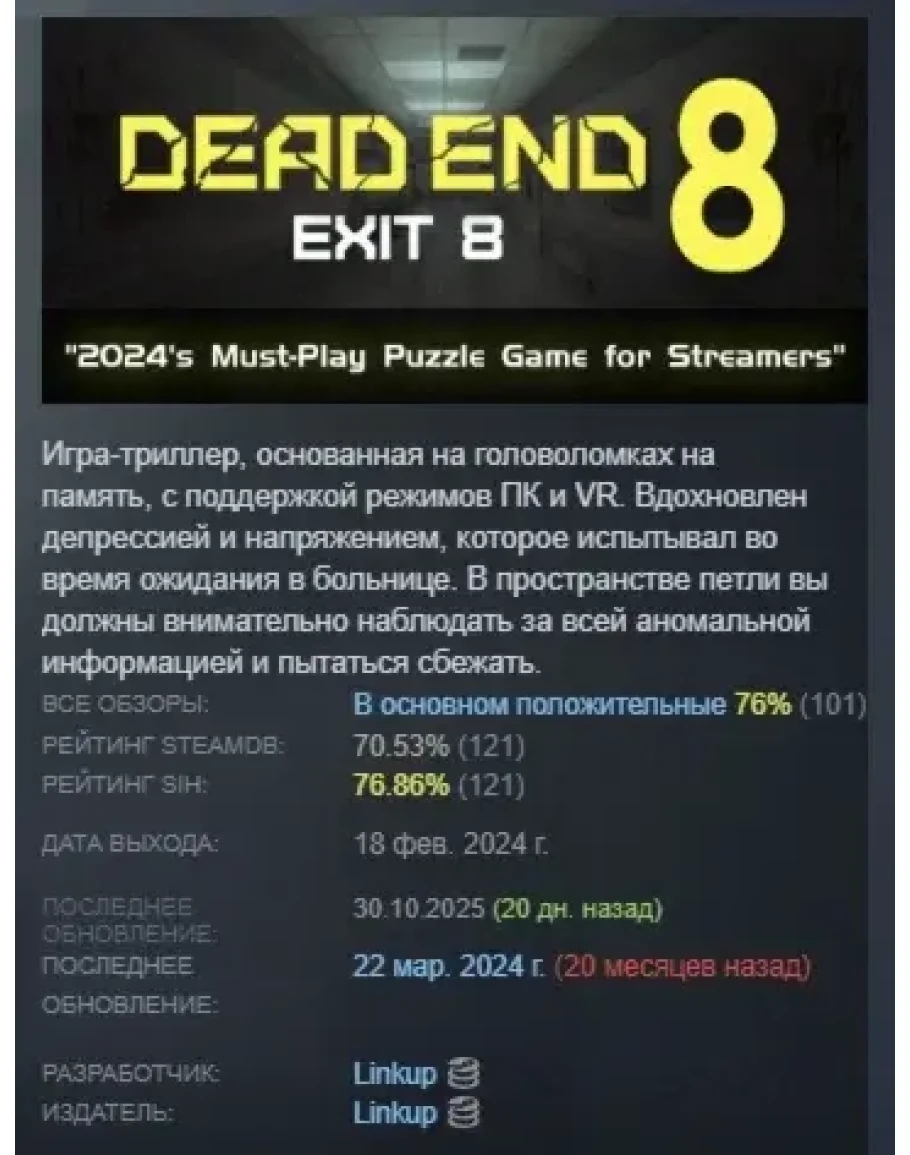 https://store.steampowered.com/app/2780270/Dead_end_Exit_8/