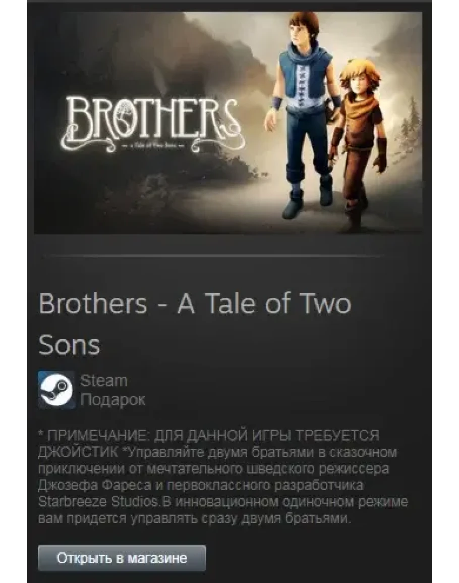 Управляйте двумя братьями в сказочном приключении от мечтательного шведского режиссера Джозефа Фареса и первоклассного разработчика Starbreeze Studios.
