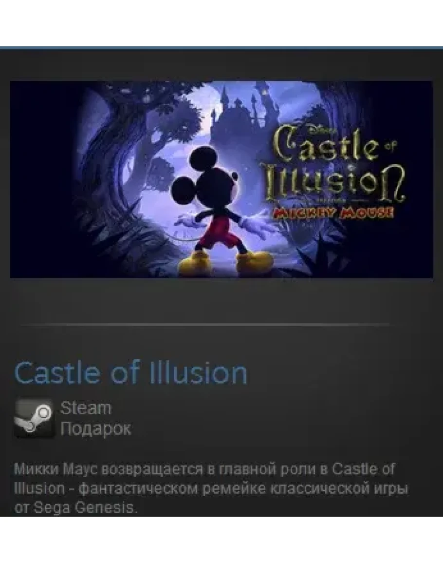 Микки Маус возвращается в главной роли в Castle of Illusion - фантастическом ремейке классической игры от Sega Genesis. Новизна графики и геймплея по-настоящему оживляет Микки и его мир в этом волшебном диснеевском приключении. Когда злая ведьма Мизрабель похищает Минни, Микки предстоит ее спасти, путешествуя по пяти мирам. Вас ждут волшебные леса, полчища мятежных игрушек и лабиринты с живыми книгами. Вы также можете проходить скрытые испытания, чтобы одевать Микки в классические костюмы.