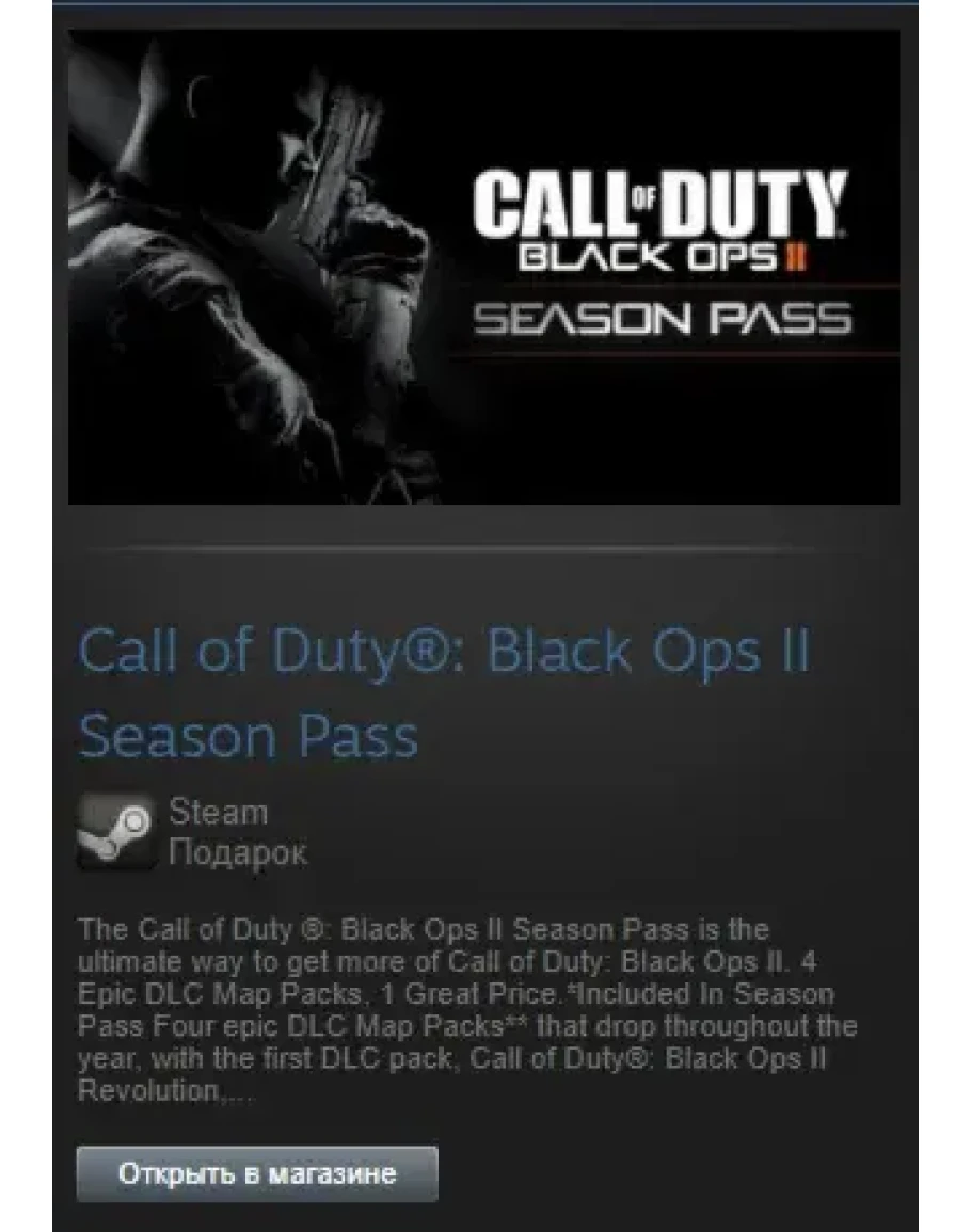 The Call of Duty ®: Black Ops II Season Pass is the ultimate way to get more of Call of Duty: Black Ops II. 4 Epic DLC Map Packs, 1 Great Price.*