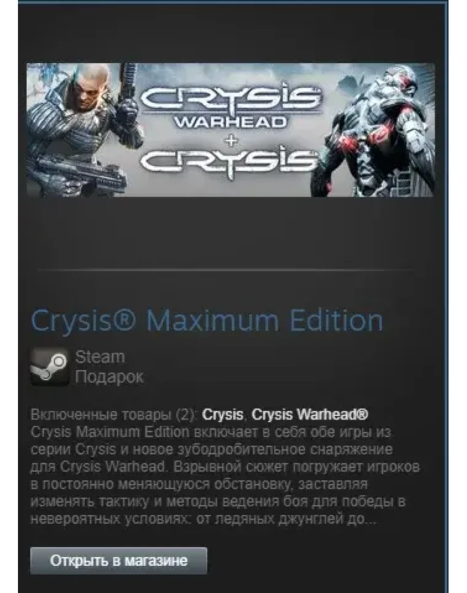 Crysis Maximum Edition включает в себя обе игры из серии Crysis и новое зубодробительное снаряжение для Crysis Warhead. Взрывной сюжет погружает игроков в постоянно меняющуюся обстановку, заставляя изменять тактику и методы ведения боя для победы в невероятных условиях: от ледяных джунглей до невесомости. Полноценная многопользовательская игра в Crysis Wars® — это совершенно новый опыт сетевой игры с новыми режимами и 21 картой, из которых семь — абсолютно новые места сражений игроков друг против друга.