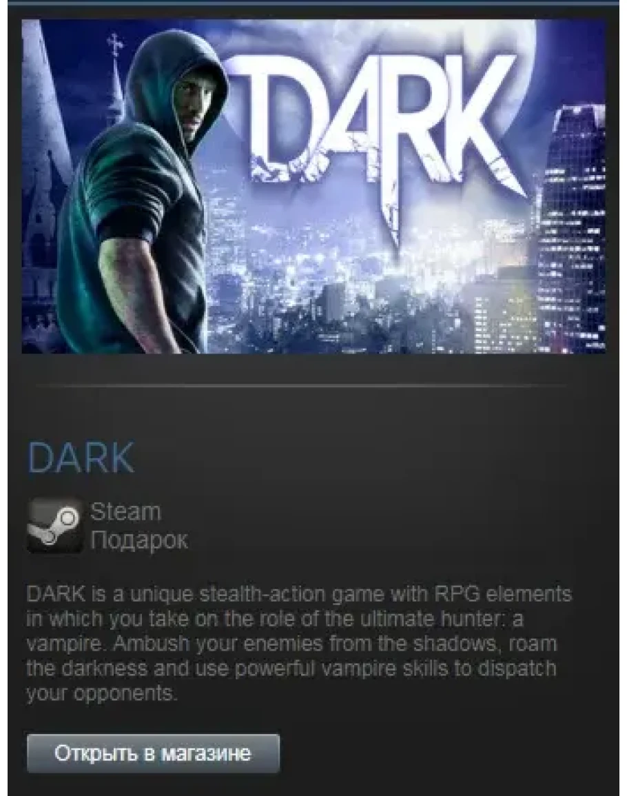 DARK is a unique stealth-action game with RPG elements in which you take on the role of the ultimate hunter: a vampire. Ambush your enemies from the shadows, roam the darkness and use powerful vampire skills to dispatch your opponents.
