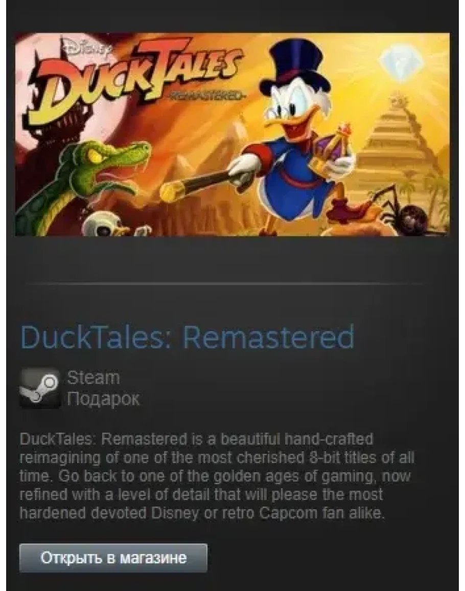 DuckTales: Remastered - это красочный, нарисованный вручную ремейк одной из самых милых сердцу 8-битных игр всех времен. Возвращайтесь в золотую эру видеоигр, но с таким уровнем детализации, который удовлетворит в равной мере как самых ярых поклонников диснеевских мультиков, так и фанатов ретро-игр от Capcom. Нарисованные вручную анимированные персонажи, озвученные узнаваемыми голосами актеров Disney, детально проработанные фоны уровней по мотивам классического телевизионного мультфильма делают Скруджа Макдака и его семейку еще живее, чем когда-либо. Геймплей сохранил аутентичность своего 8-битного предшественника: он все так же прост и увлекателен, с небольшими изменениями для улучшения игрового процесса и графики. Окунитесь в настоящий мир приключений DuckTales вместе со Скруджем Макдаком и его тремя племянниками: Билли, Вилли и Дилли отправляются в путешествие по экзотическим местам в поисках пяти легендарных сокровищ.