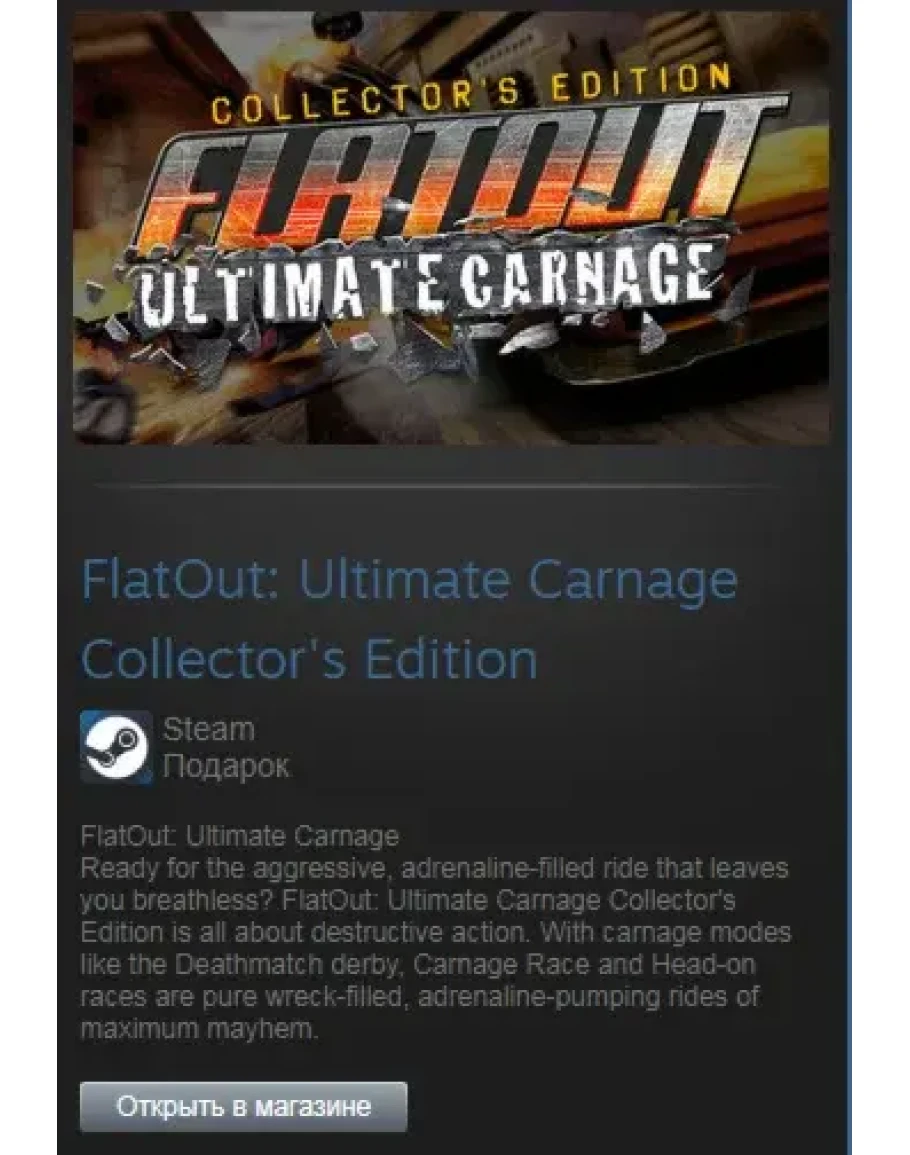 This new Collector's Edition of FlatOut Ultimate Carnage contains bug fixes, achievements, improved loading times, cloud saves, more languages, and digital goodies; all free for the original owners of FlatOut: Ultimate Carnage!