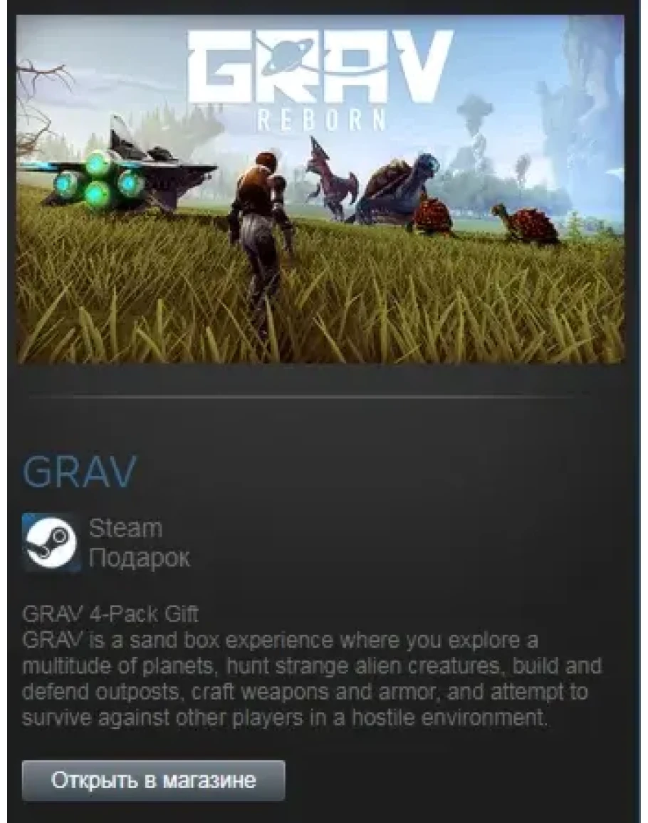 GRAV is a sand box experience where you explore a multitude of planets, hunt strange alien creatures, build and defend outposts, craft weapons and armor, and attempt to survive against other players in a hostile environment.