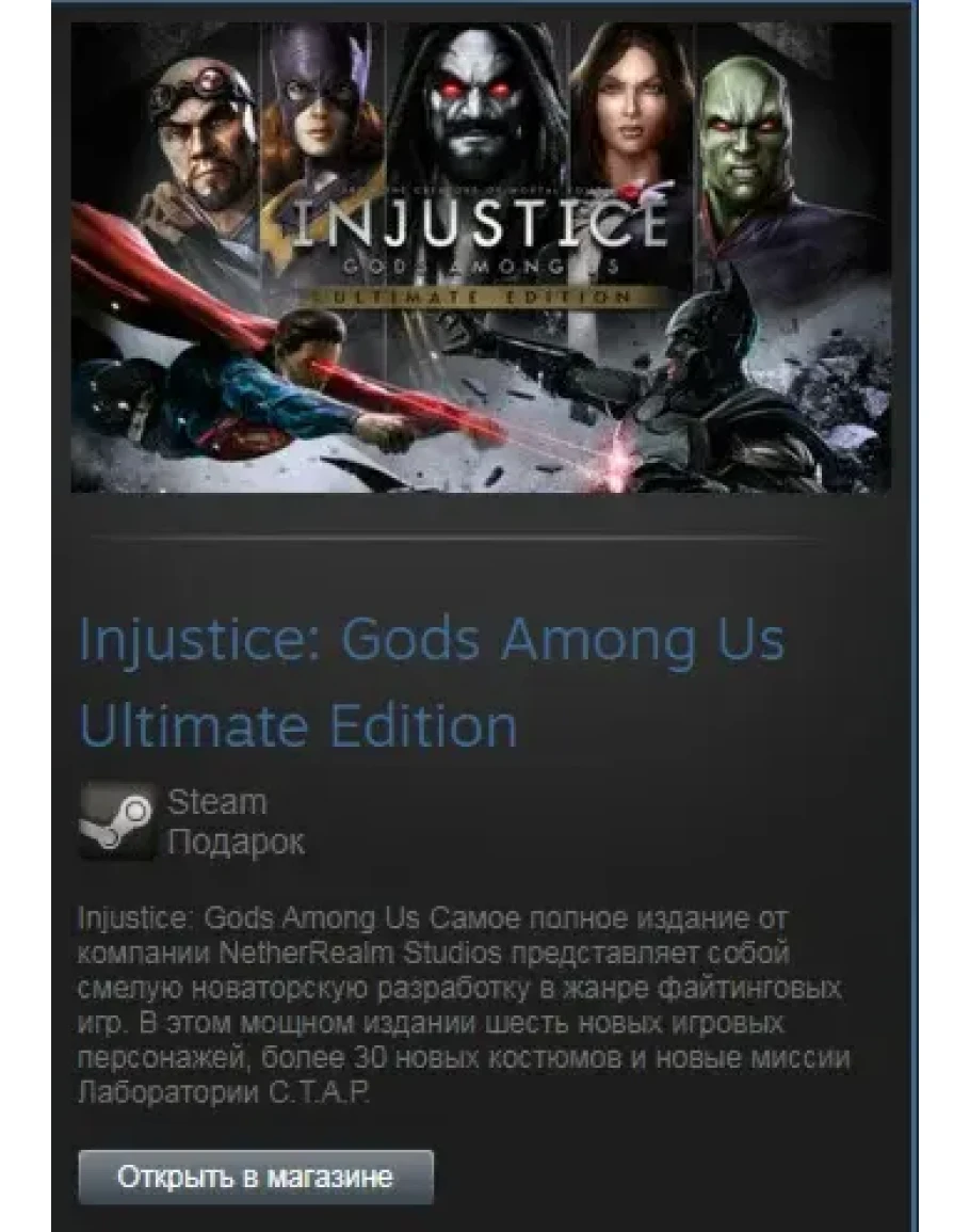 Injustice: Gods Among Us Самое полное издание от компании NetherRealm Studios представляет собой смелую новаторскую разработку в жанре файтинговых игр. В этом мощном издании шесть новых игровых персонажей, более 30 новых костюмов и новые миссии Лаборатории С.Т.А.Р. В этой новейшей игре от удостоенной множества наград студии вас ждут не только знаковые персонажи DC Comics, такие как Бэтмен, Джокер, Зеленый Фонарь, Флэш, Супермен и Чудо-женщина, но и глубокий оригинальный сюжет. В мире, где стирается грань между добром и злом, герои и злодеи сойдутся в битвах эпического масштаба.