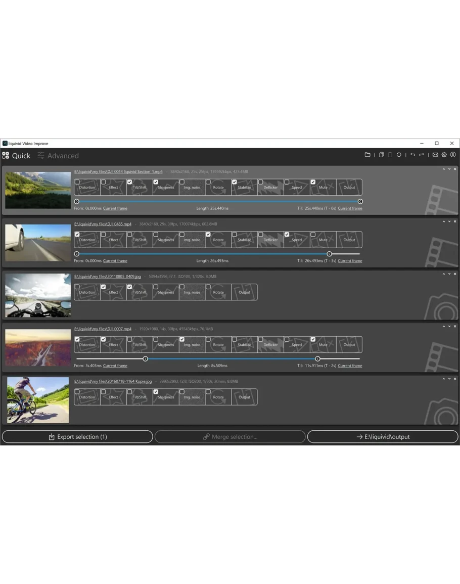Liquivid Video Improve предлагает множество привлекательных визуальных эффектов, устраняет искажение линзы, вызываемое линзами с широким обзором (как в большинстве экшн-камер), убирает дрожание камеры и шумы изображения, а также улучшает цвет и резкость. Базовая видео нарезка, пакетная обработка и поддержка всех распространенных видео форматов, кодеков и разрешений, делают его излюбленным инструментом всех тех, кто хочет получить из своих фотографий больше.