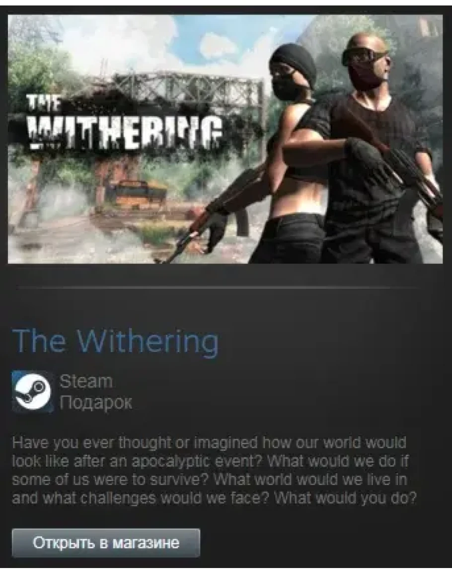 "The Withering" is a modern world post apocalyptic survival horror simulator. The story puts players in a world where a terrible viral infection wiped 90% of the population, which in return triggered a series of catastrophic events laying devastation on already dying world.