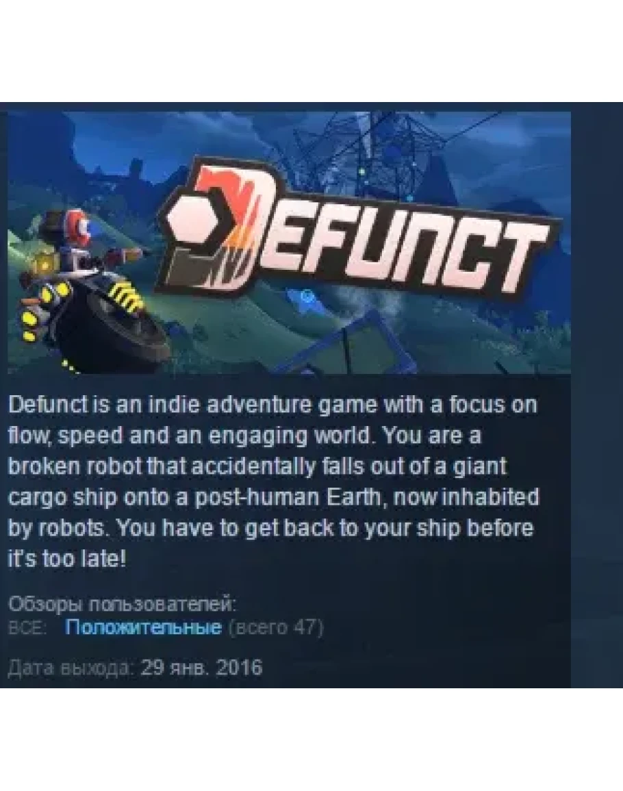 Defunct is an indie adventure game with a focus on flow, speed and an engaging world. You are a broken robot that accidentally falls out of a giant cargo ship onto a post-human Earth, now inhabited by robots. You have to get back to your ship before it’s too late!
