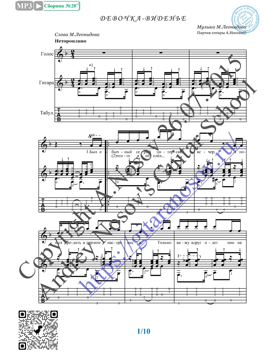 Кликните "Подробнее" для получения дополнительной информацииВашему вниманию предлагается композиция "Девочка-виденье (М.Леонидов)", предназначенная для вокала в сопровождении 6-ти струнной гитары (pdf / png*). Запись выполнена нотами и включает в себя партию вокала с подтекстовкой, партию гитары с подробнейшей аппликатурой, текст песни (НА РУССКОМ ЯЗЫКЕ). Партия гитары продублирована табулатурой. Прилагается ссылка на скачивание mp3.
