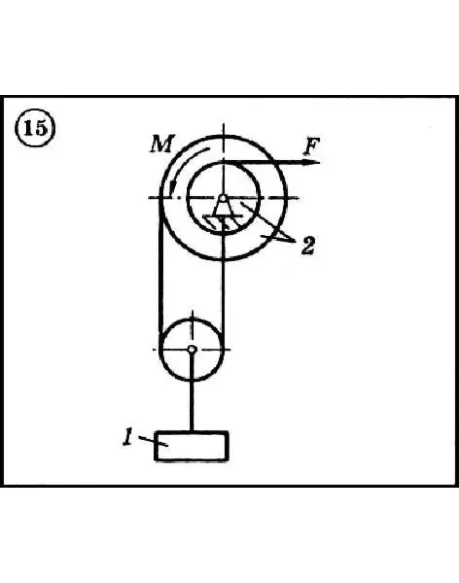 Для представленной на рисунке схеме используя принцип Лагранжа, определить величину силы F (при наличии трения - максимальное значение этой величины), при которой механическая система будет находиться в равновесии. Исходные данные: вес груза G = 20 кН, вращающий момент M = 1 кНм, радиус барабана R2 = 0,4м (у двойного барабана имеется также r2 = 0,2м), угол α = 300 и коэффициент трения скольжения f = 0,5. Ненумерованные блоки и катки считать невесомыми. Трением на осях барабана и блоков пренебречь.
