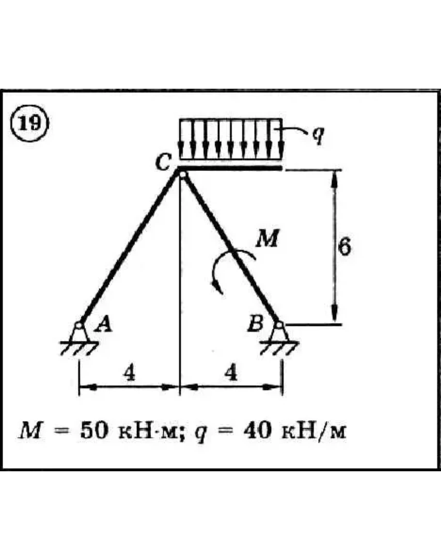 Для представленной на схеме составной конструкции найти реакции опор используя принцип возможных скоростей или принцип возможных перемещений Лагранжа. Размеры указаны в метрах. Весом элементов конструкции пренебречь.