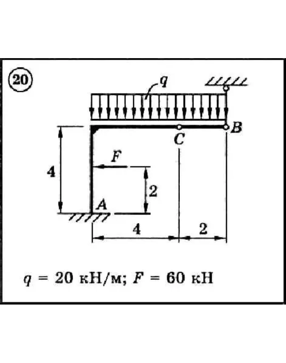 Для представленной на схеме составной конструкции найти реакции опор используя принцип возможных скоростей или принцип возможных перемещений Лагранжа. Размеры указаны в метрах. Весом элементов конструкции пренебречь.