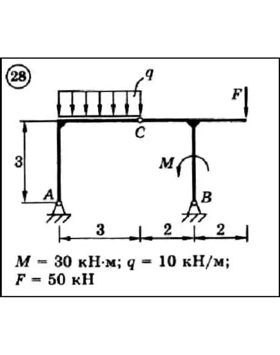 Для представленной на схеме составной конструкции найти реакции опор используя принцип возможных скоростей или принцип возможных перемещений Лагранжа. Размеры указаны в метрах. Весом элементов конструкции пренебречь.