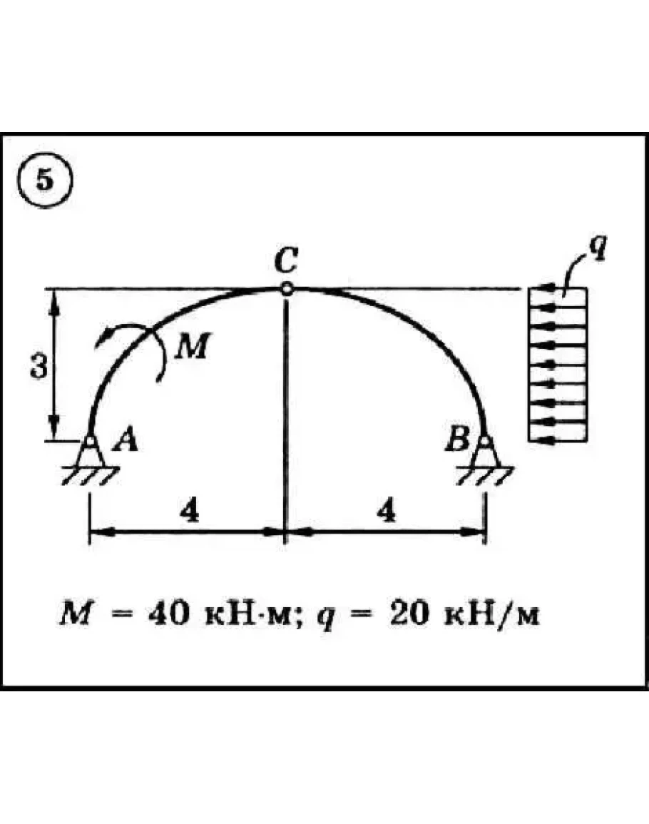Для представленной на схеме составной конструкции найти реакции опор используя принцип возможных скоростей или принцип возможных перемещений Лагранжа. Размеры указаны в метрах. Весом элементов конструкции пренебречь.
