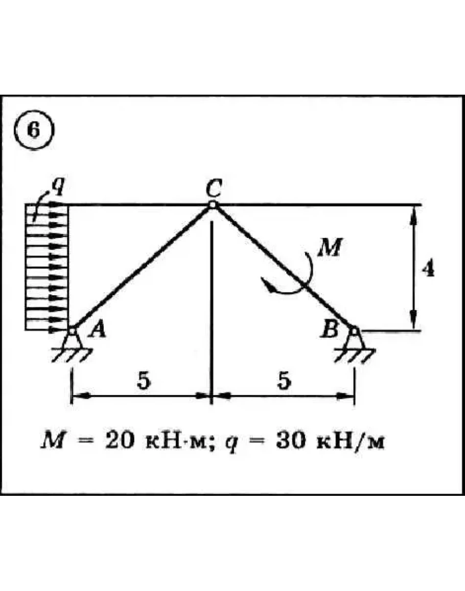 Для представленной на схеме составной конструкции найти реакции опор используя принцип возможных скоростей или принцип возможных перемещений Лагранжа. Размеры указаны в метрах. Весом элементов конструкции пренебречь.