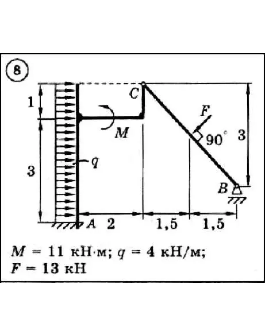 Для представленной на схеме составной конструкции найти реакции опор используя принцип возможных скоростей или принцип возможных перемещений Лагранжа. Размеры указаны в метрах. Весом элементов конструкции пренебречь.