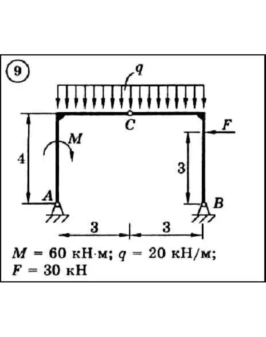Для представленной на схеме составной конструкции найти реакции опор используя принцип возможных скоростей или принцип возможных перемещений Лагранжа. Размеры указаны в метрах. Весом элементов конструкции пренебречь.
