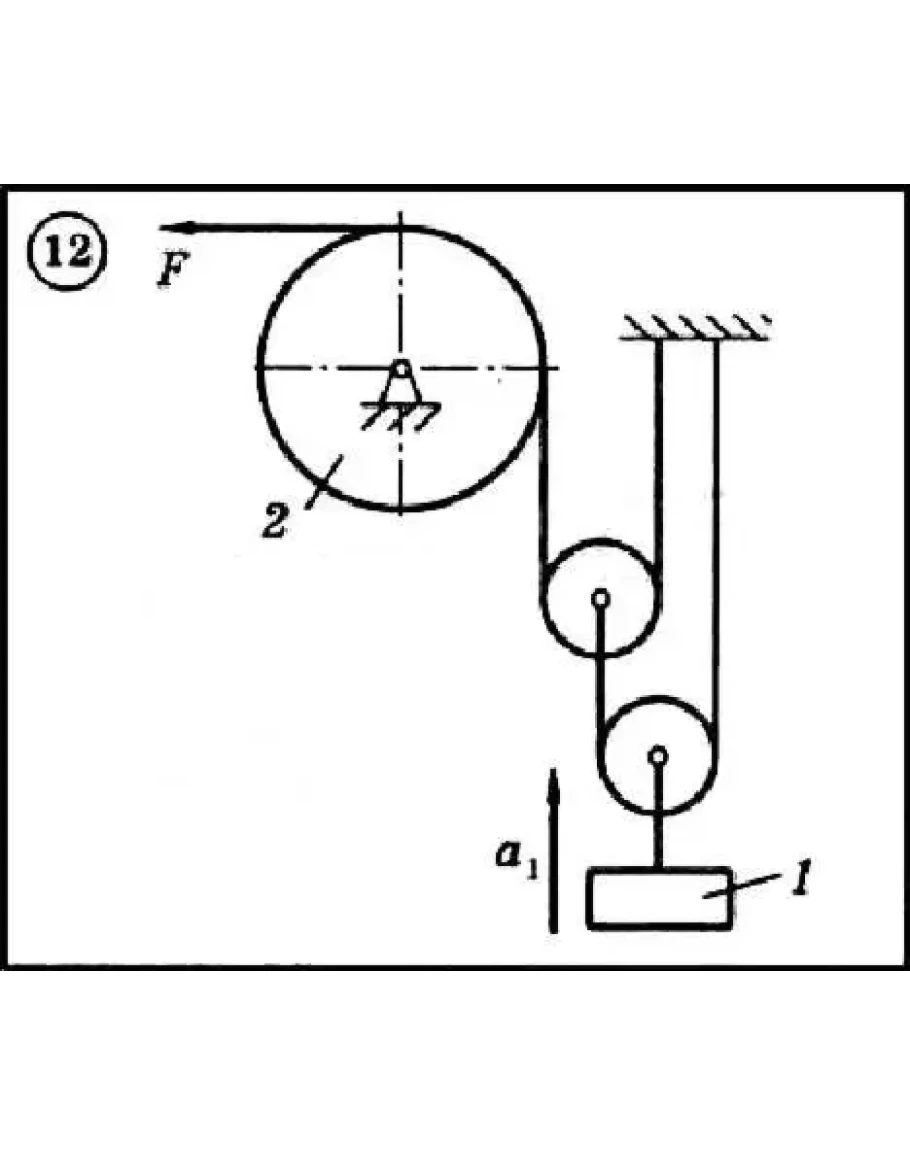 Для приведенной на схеме механической системы, используя принцип Даламбера, определить величину силы F, необходимую для перемещения груза с заданным ускорением a1, а также усилие в грузовом тросе. Исходные данные: массы груза m1 и барабана m2, радиус барабана R2 (у двойного барабана имеется также r2), его радиус инерции ρ2 (если он не задан, тело считать однородным цилиндром), угол α и коэффициент трения скольжения f приведены в таблице. Непронумерованные блоки и катки считать невесомыми. Трением на осях барабана и блоков пренебречь.