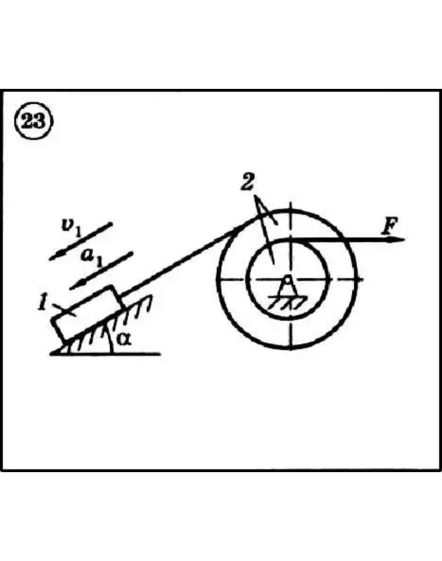 Для приведенной на схеме механической системы, используя принцип Даламбера, определить величину силы F, необходимую для перемещения груза с заданным ускорением a1, а также усилие в грузовом тросе. Исходные данные: массы груза m1 и барабана m2, радиус барабана R2 (у двойного барабана имеется также r2), его радиус инерции ρ2 (если он не задан, тело считать однородным цилиндром), угол α и коэффициент трения скольжения f приведены в таблице. Непронумерованные блоки и катки считать невесомыми. Трением на осях барабана и блоков пренебречь.