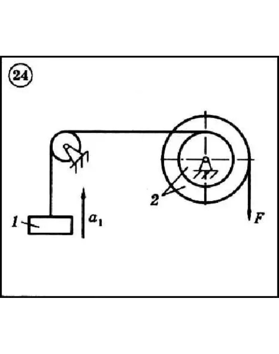 Для приведенной на схеме механической системы, используя принцип Даламбера, определить величину силы F, необходимую для перемещения груза с заданным ускорением a1, а также усилие в грузовом тросе. Исходные данные: массы груза m1 и барабана m2, радиус барабана R2 (у двойного барабана имеется также r2), его радиус инерции ρ2 (если он не задан, тело считать однородным цилиндром), угол α и коэффициент трения скольжения f приведены в таблице. Непронумерованные блоки и катки считать невесомыми. Трением на осях барабана и блоков пренебречь.